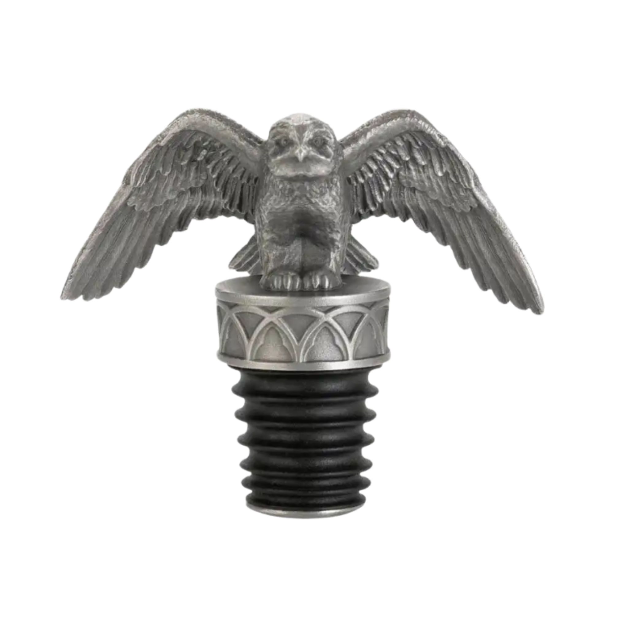 Beautifully sculpted with wings spread, Harry’s snowy owl Hedwig seems to have taken it upon herself to safeguard your bottle of Butterbeer or Muggle wine. In pewter and food safe silicone.